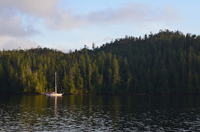 "Red sky at night, sailor delight, red sky at morn, sailor be warned". I don't shoot a lot of sunrises, I'm lazy for starters and the sunrises on the west coast are generally shrouded in fog. However, this one was definitely red, so we paid attention. We had stayed in that corner of the bay for a couple of days, enjoying the good weather, but the weather forecast was turning sour, and there was a major blow predicted for the coast, winds southeast to 45 knots in our area, 55 knots further north. We thought that the other side of the bay would be more protected and the predicted wind put us on a lee shore where we were currently, so we upped anchor on the 25th and moved to the southeast corner, where we would be protected by the tall trees.